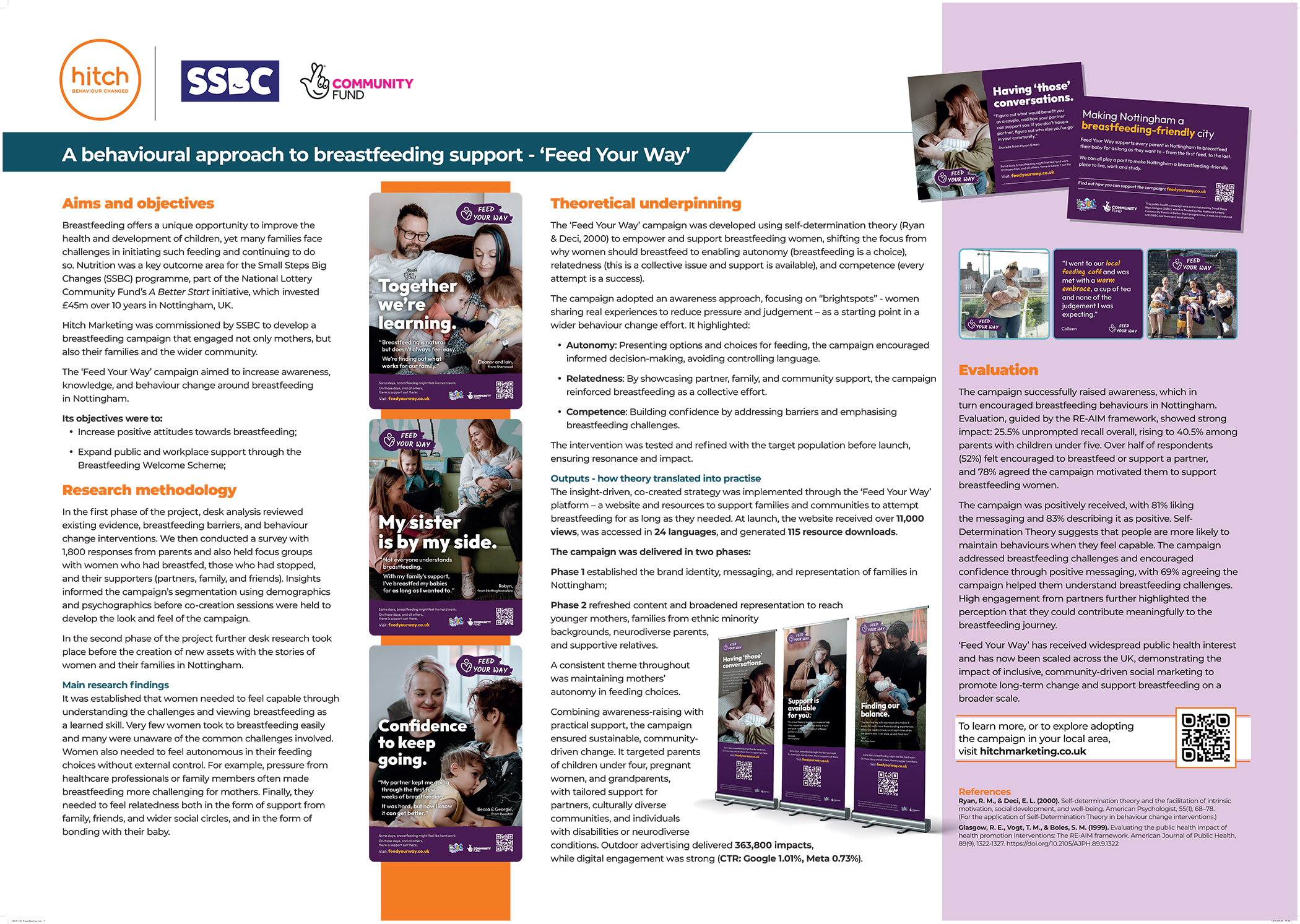 The “Feed Your Way” campaign aimed to support breastfeeding initiation and continuation in Nottingham and Nottinghamshire, UK, through an inclusive public health initiative underpinned by self-determination theory. Applying behavioural insights and a co-created social marketing approach, the campaign prioritised autonomy, community support, and confidence-building over traditional health-focused messaging. This innovative approach successfully fostered positive attitudes toward breastfeeding and inspired wider public health interest and adoption across the UK.