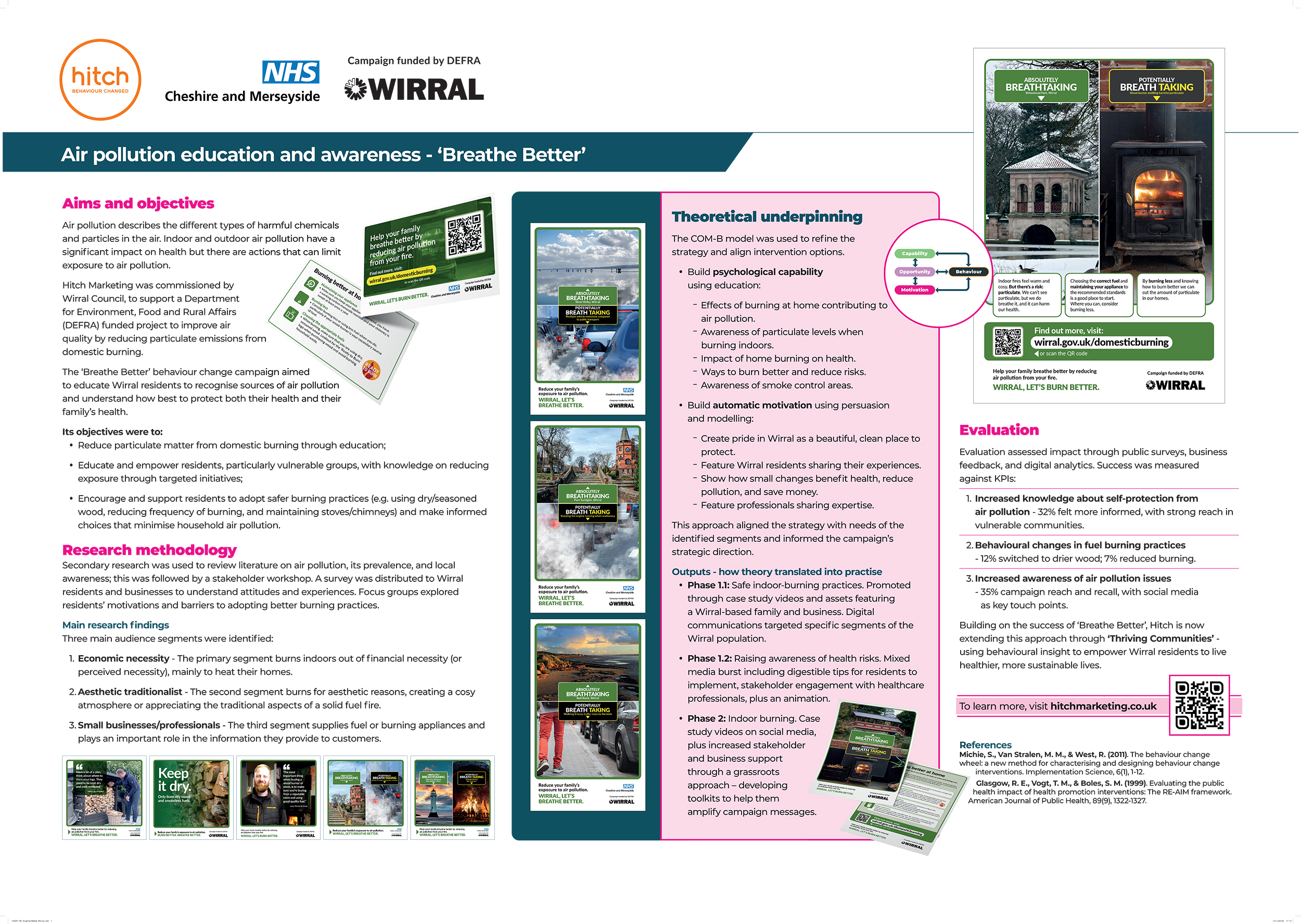 The “Breathe Better” campaign, funded by DEFRA and commissioned by Wirral Council, aimed to reduce air pollution caused by domestic burning in Wirral, UK. Using behavioural insights, audience segmentation, and hyper-local messaging, it educated residents on safer burning practices, reduced particulate emissions, and promoted healthier behaviours. Through targeted storytelling, stakeholder collaboration, and community-led engagement, the campaign improved awareness of air quality, drove measurable behaviour change, and provided a blueprint for future environmental and public health initiatives.