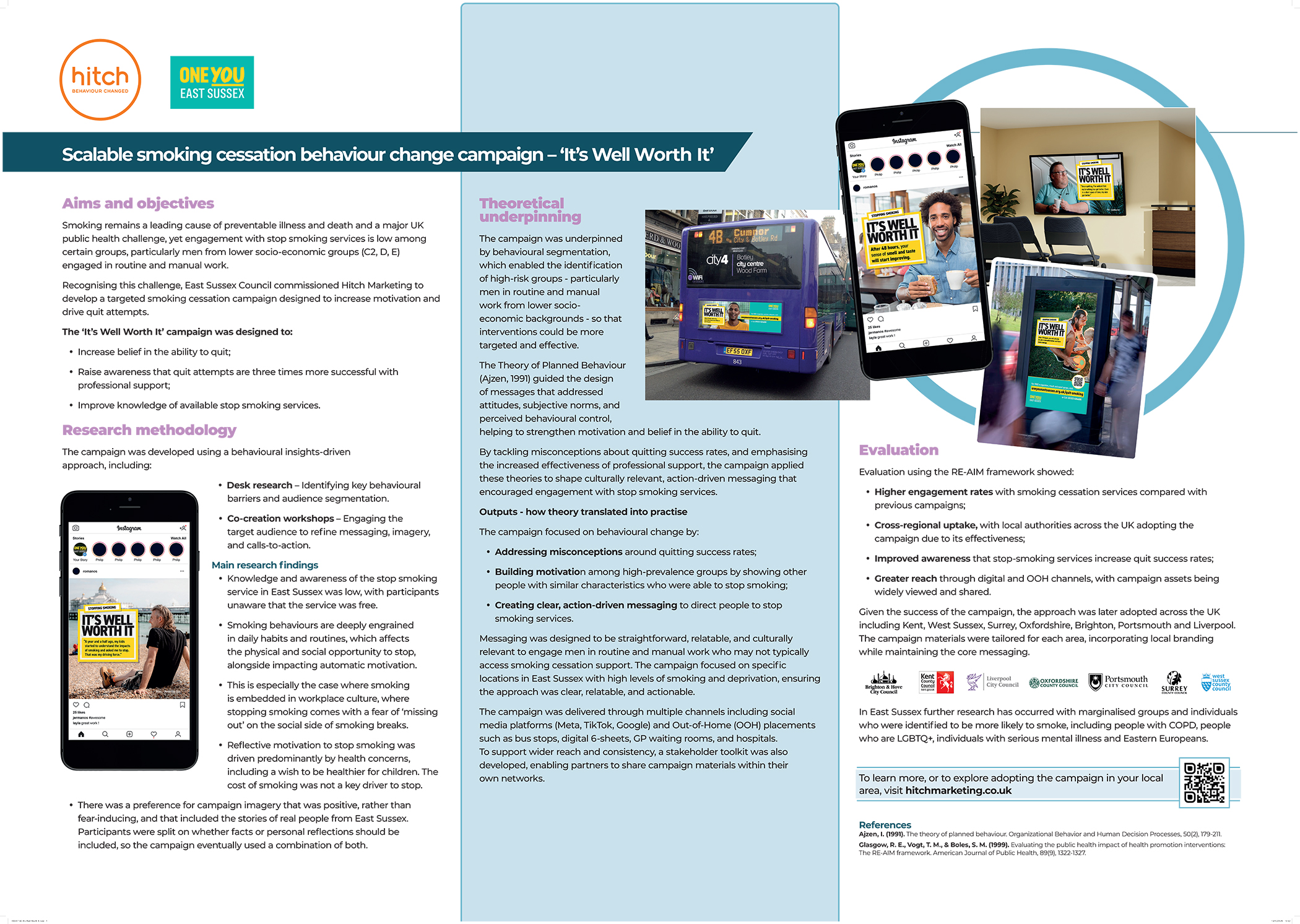 The “It’s Well Worth It” smoking cessation campaign used behavioural insights and social marketing to engage men aged 25-35 from lower socio-economic groups (C2, D, E) working in routine and manual occupations - identified as having high smoking prevalence and low engagement with cessation services. Initially launched in East Sussex, UK, the campaign’s clear, relatable, and actionable messaging led to significant success and was later adopted across other regions, including Kent, West Sussex, Surrey, Oxfordshire, Brighton, Portsmouth, and Liverpool. Through co-creation, audience segmentation, and multi-channel delivery across digital, Out-of-Home, and healthcare settings, the campaign demonstrated the impact of tailored, scalable social marketing. Its success provides a blueprint for designing adaptable, insight-led public health campaigns that drive meaningful behaviour change among high-risk groups.
