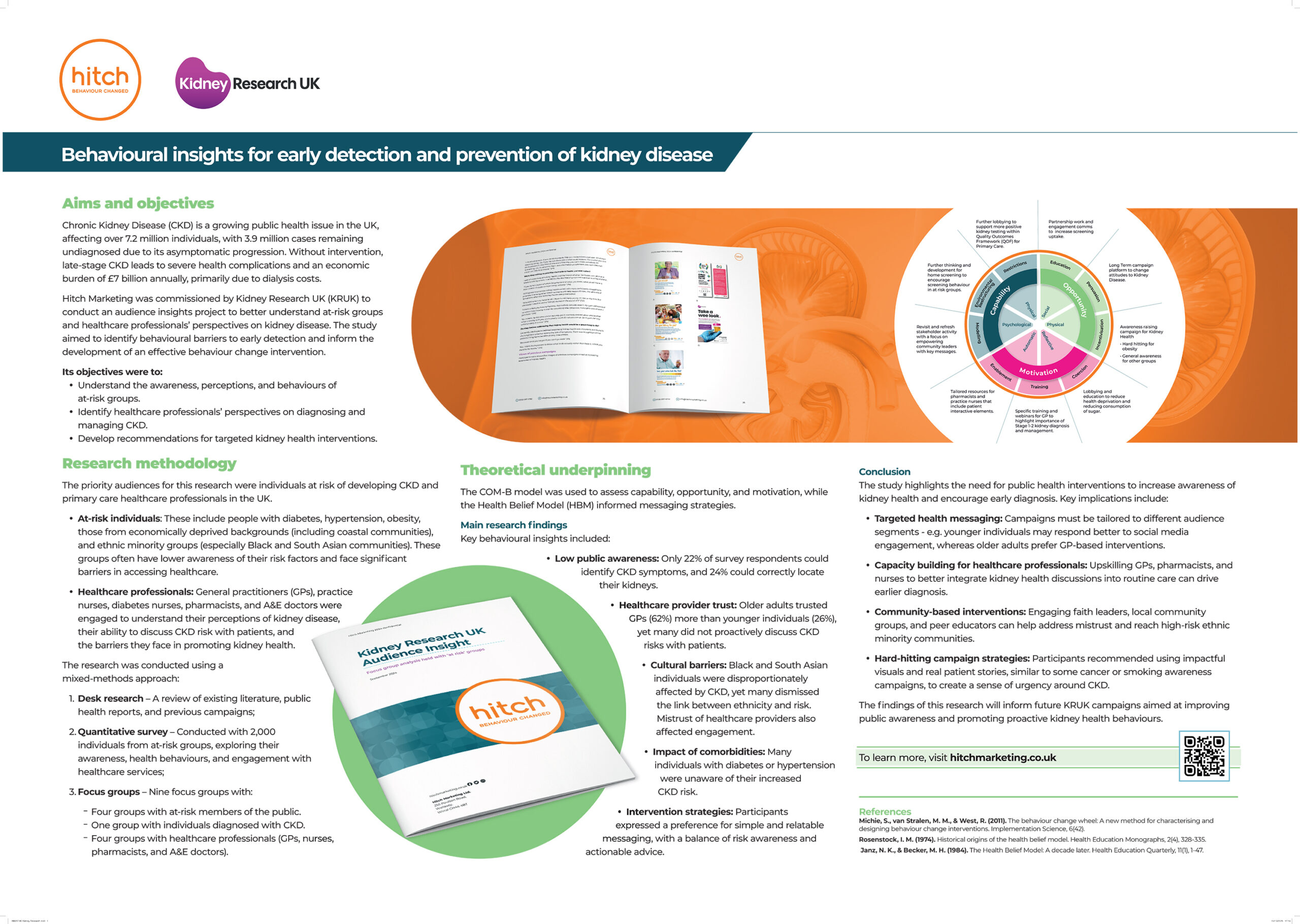 Kidney Research UK (KRUK) commissioned Hitch to conduct an audience insights study to better understand at-risk groups and healthcare professionals’ perspectives on kidney disease. The research explored behavioural barriers to early detection and prevention of Chronic Kidney Disease (CKD), including low awareness, cultural factors, and healthcare access challenges. Findings informed recommendations for targeted interventions and social marketing strategies to support earlier diagnosis, empower healthcare professionals, and encourage proactive kidney health management.