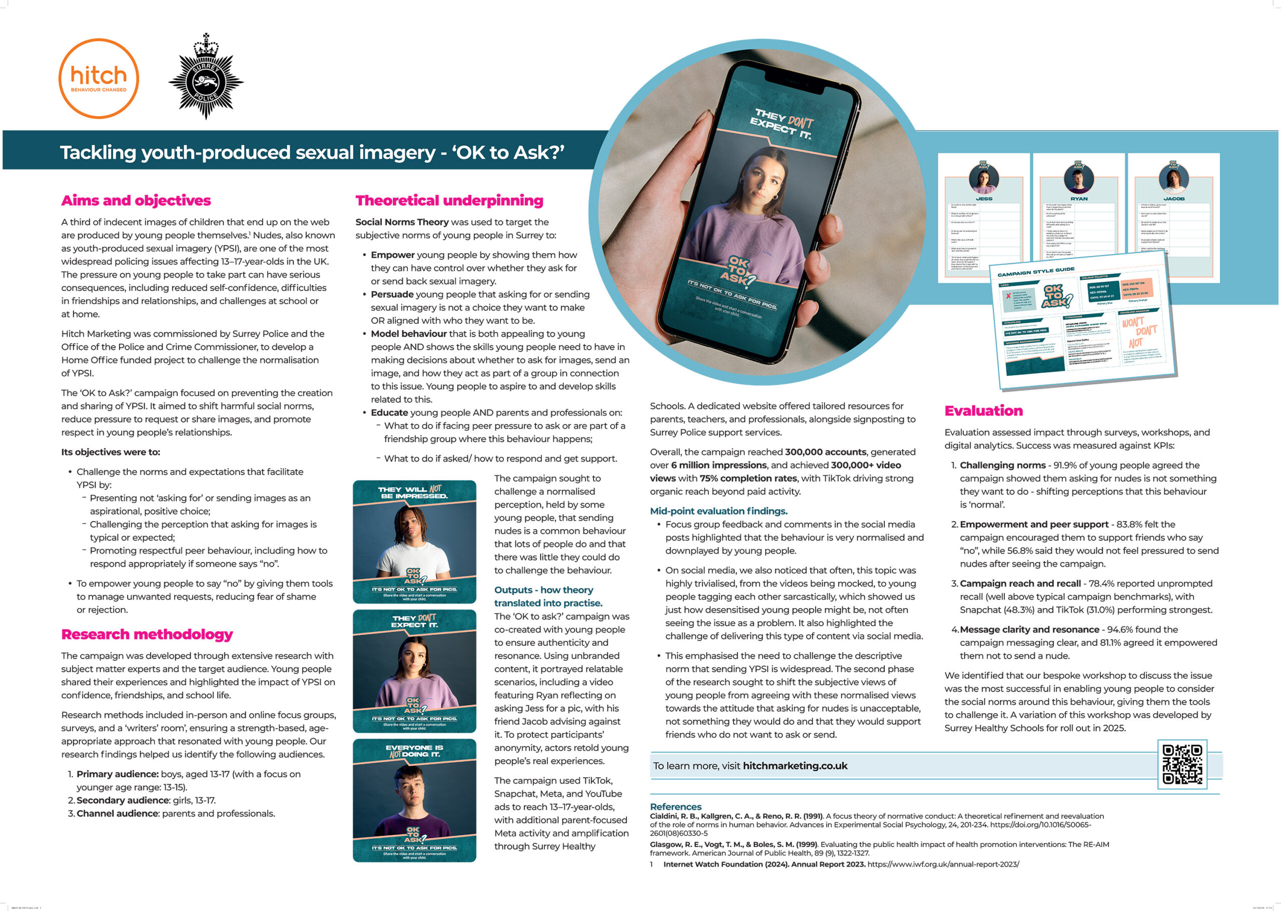 The "OK to Ask?" campaign aimed to prevent the creation and sharing of youth-produced sexual imagery (YPSI) among 13-17-year-olds in Surrey, UK. Developed with young people, it applied social norms theory, peer-led messaging, and digital engagement to challenge the normalisation of requesting nudes, empower teens to resist peer pressure, and promote respectful relationships. Through co-creation, behavioural insights, and social marketing strategies, the campaign achieved high engagement, shifted attitudes, and equipped young people, parents, and educators with practical tools to navigate this issue.