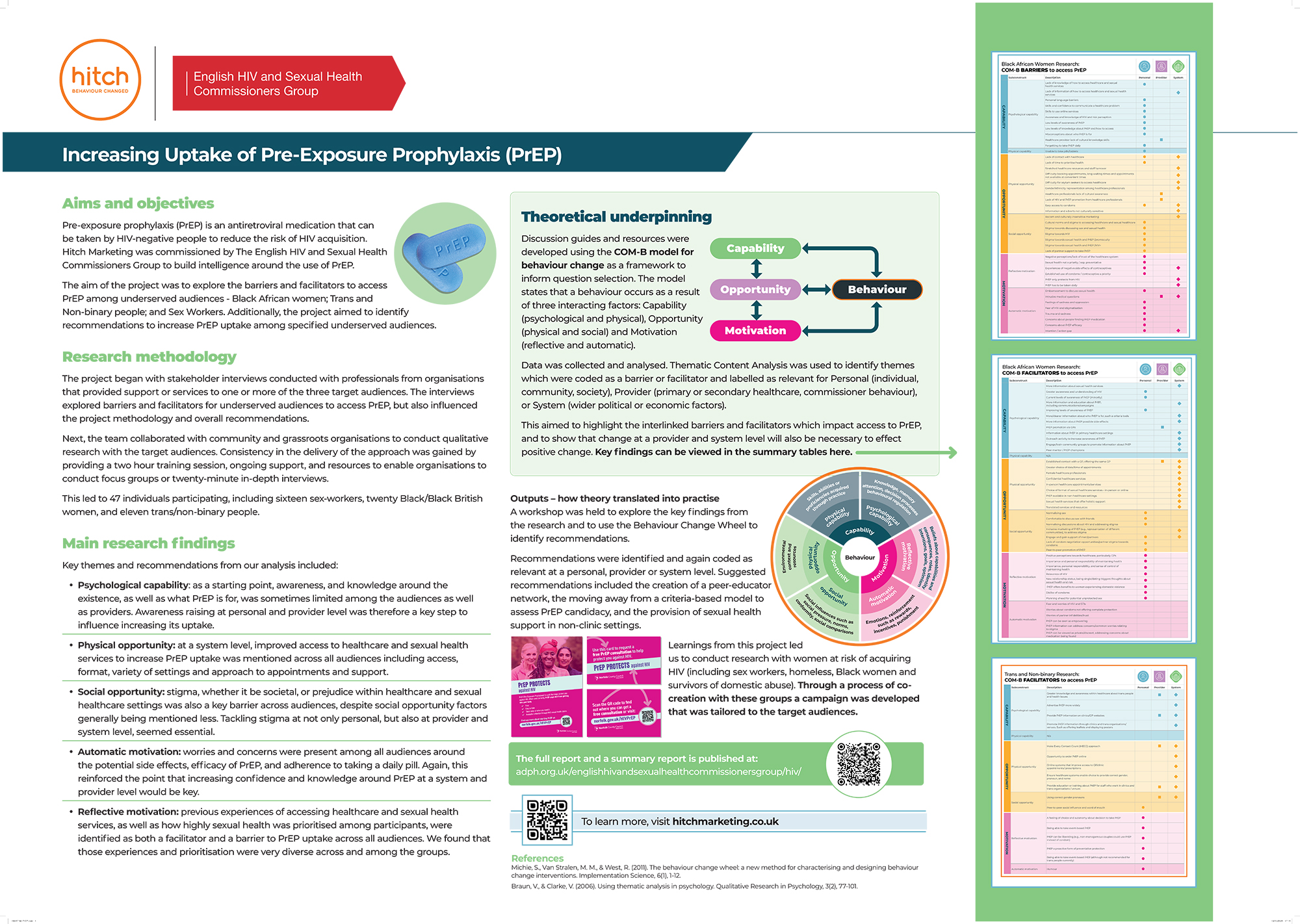 This project explored the barriers and facilitators to accessing Pre-exposure prophylaxis (PrEP), an antiretroviral medication that prevents HIV acquisition, among underserved communities, including Black African women, Trans and Non-binary individuals, and Sex Workers. Commissioned by The English HIV and Sexual Health Commissioners Group, the study applied the Behaviour Change Wheel to identify practical, multi-level recommendations to improve PrEP uptake, highlighting the need for peer-educator networks, non-clinic support, and revised access models.